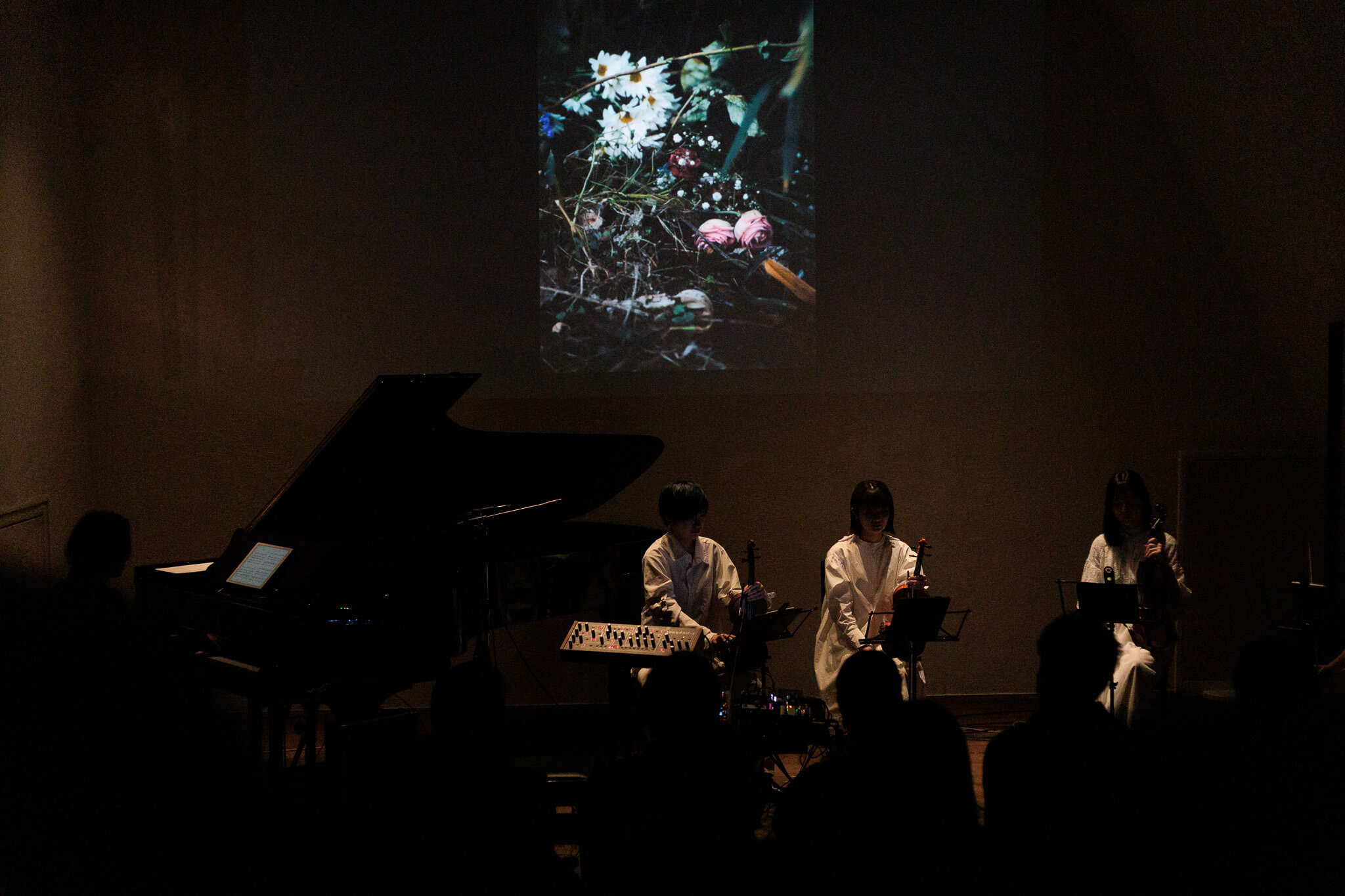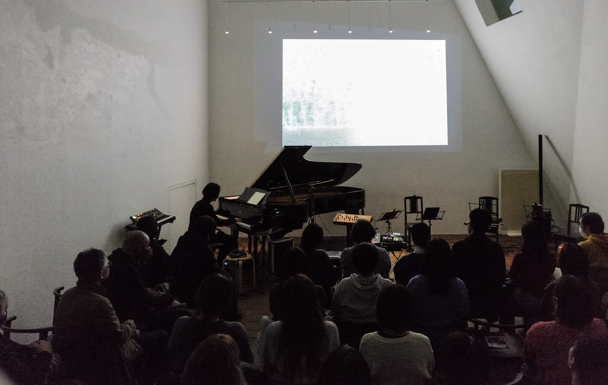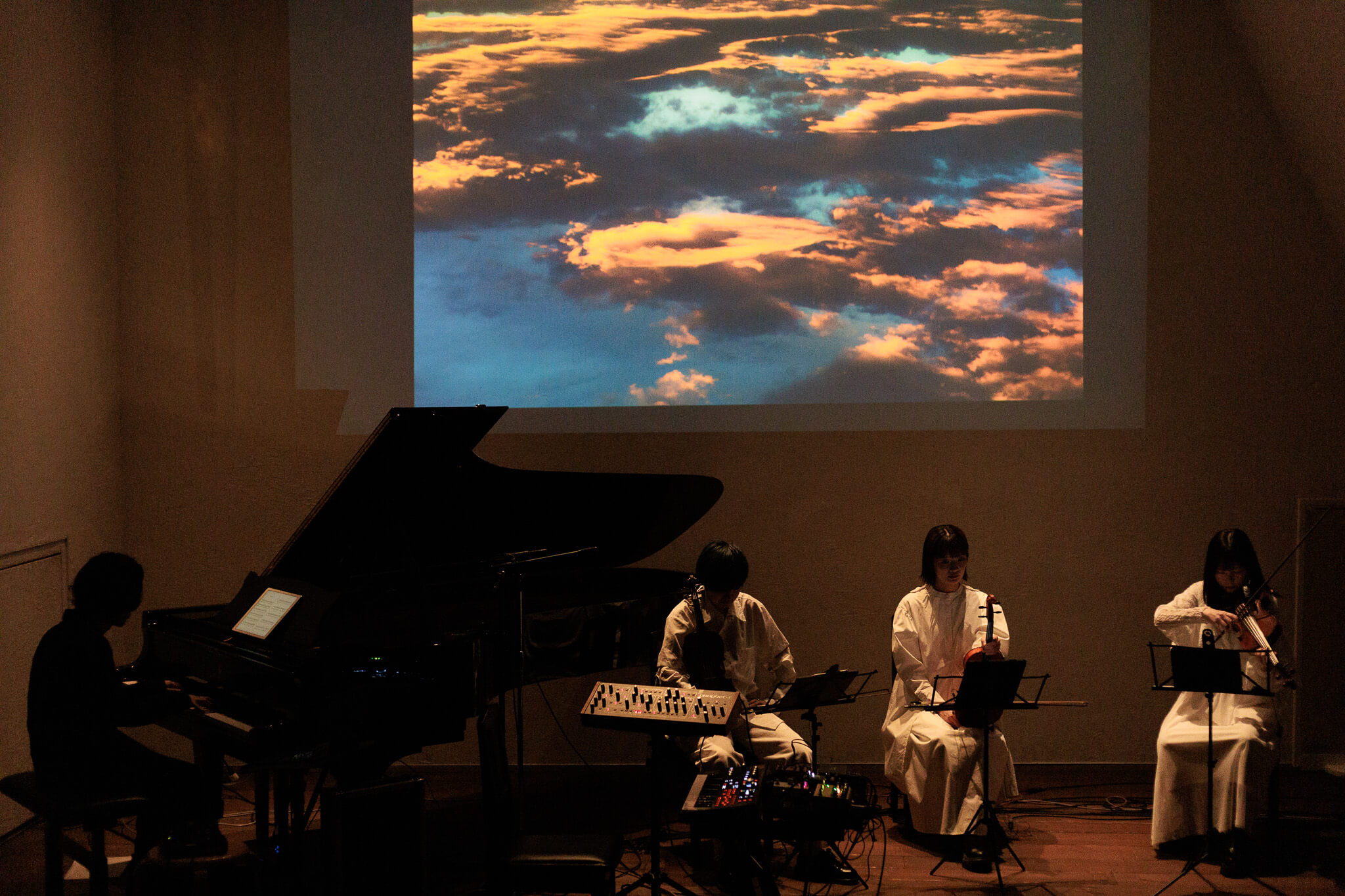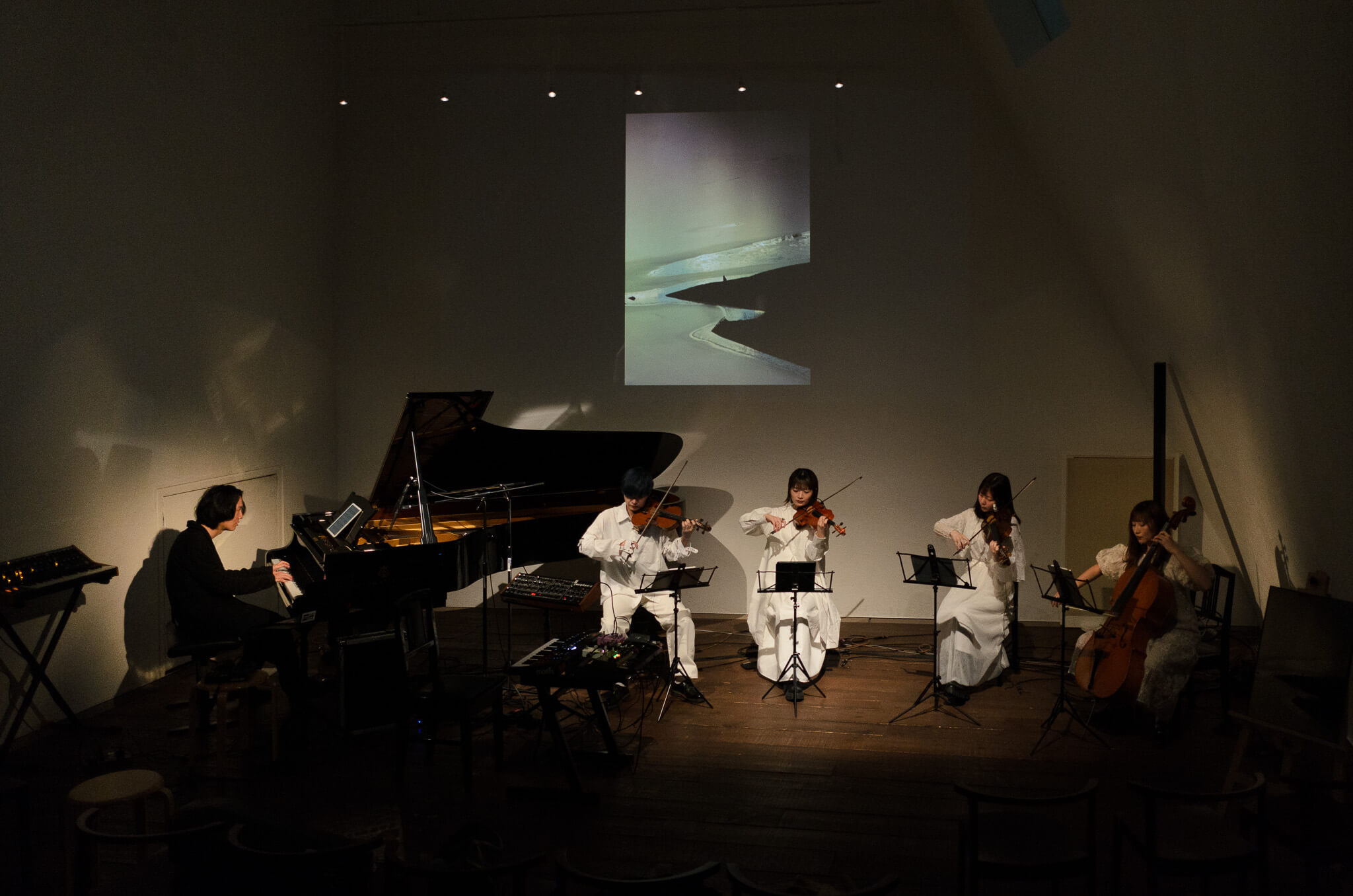 冬の澄んだ空気と静かな緊張感に包まれた会場で、約1時間半にわたり、ピアノ、シンセサイザー、そして弦楽四重奏が豊かな音響で奏でられた。楽曲ごとの映像演出とともに、テーマである「それぞれの天国」を参加者へ問いかける時間となった。